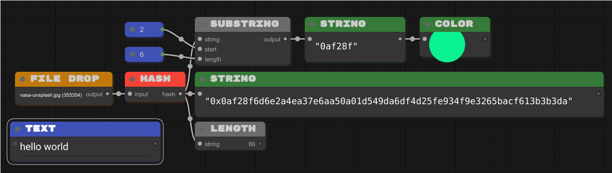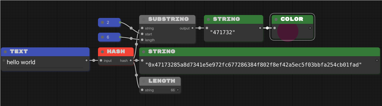 O segundo bloco STRING esta exibindo o output do SUBSTRING, e esta envidando para o bloco COLOR, que por sua vez esta exibindo uma cor baseada na string recebida como um hexadecimal.