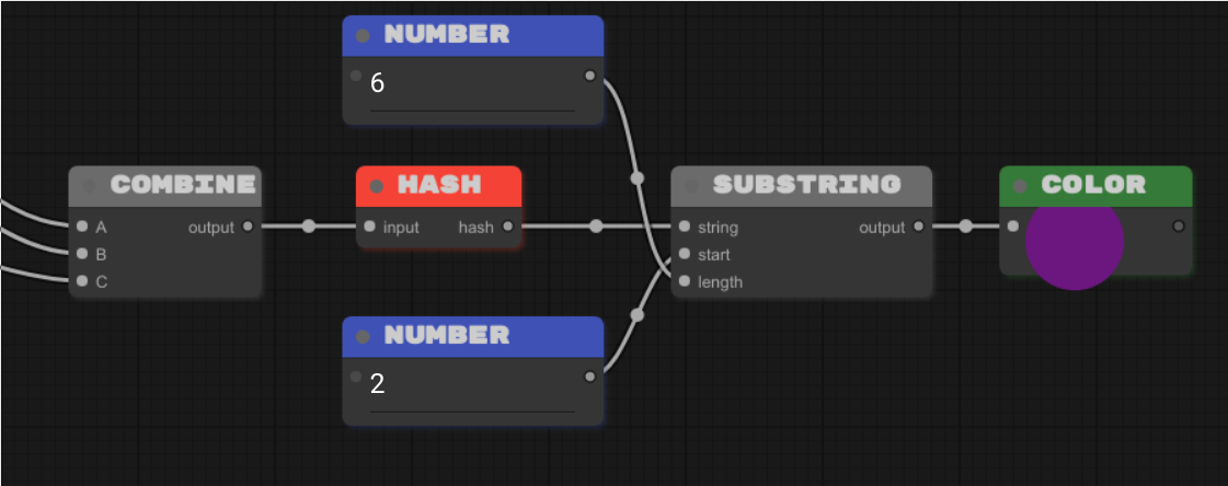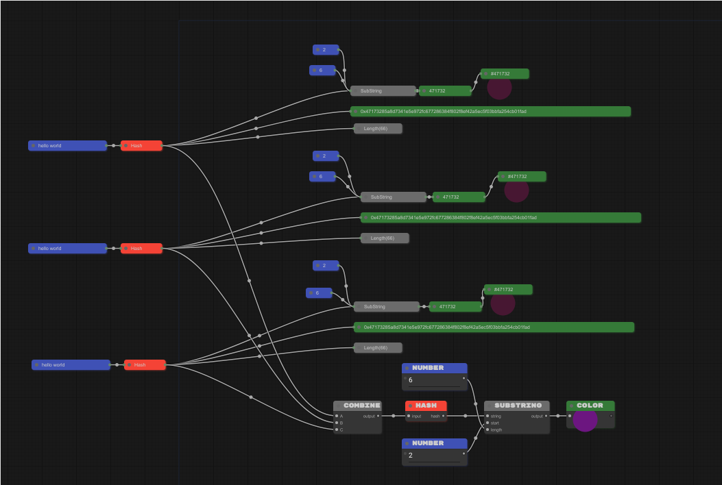 Aqui estou usando o bloco COMBINE para combinar as hashes anteriores e gerar uma nova cor com o mesmo processo.