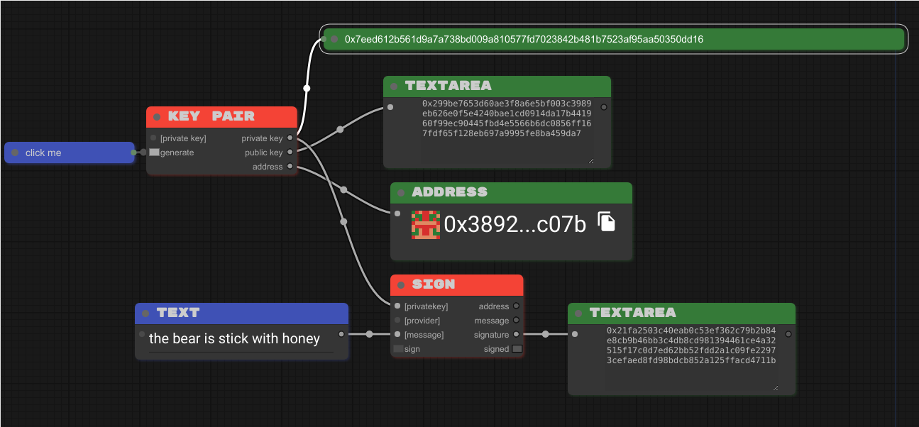 KEY PAIR é um bloco que consegue gerar uma private key, uma public key e um address baseado em um string aleatória (neste caso quem ta gerando uma string aleatória é o bloco BUTTON).