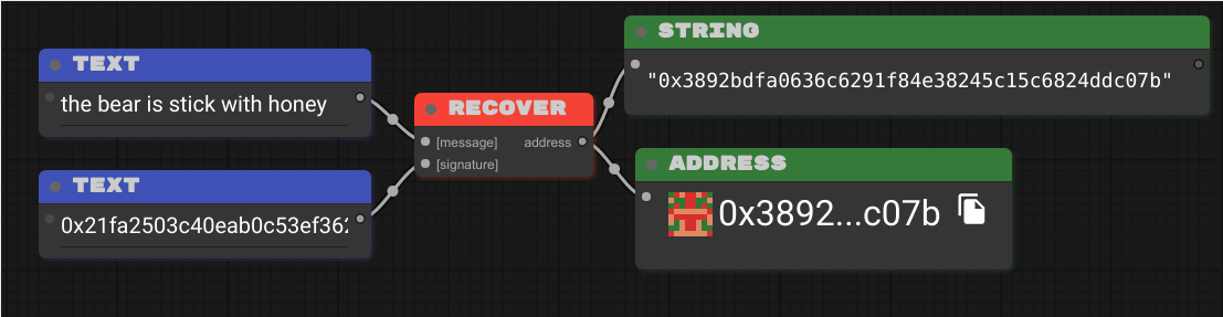 O bloco SIGN vai usar como parâmetro de input uma mensagem, no caso "the bear is stick with honey", e uma private key. A partir disso ele vai gerar uma assinatura como output: 0x21fa2503c40eab0c53ef362c79b2b84e8cb9b46bb3c4db8cd981394461ce4a32515f17c0d7ed62bb52fdd2a1c09fe22973cefaed8fd98bdcb852a125ffacd4711b