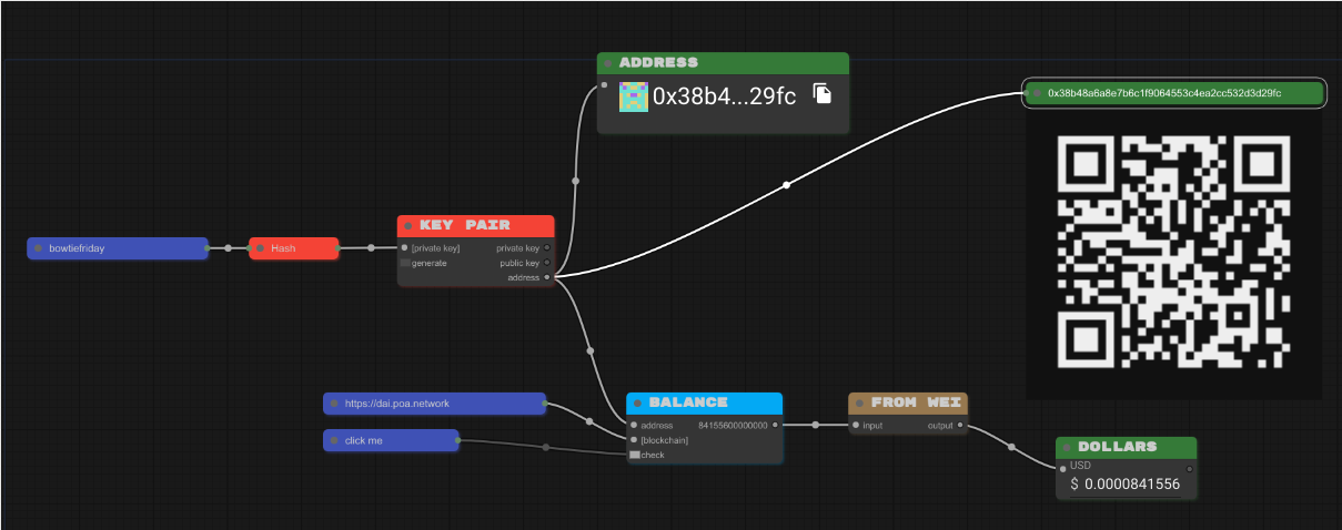 O bloco BALANCE recebe como parâmetro o endereço de uma rede blockchain existente e o endereço, e devolve o balanço monetário atual disponível para aquele endereço. O bloco FROM WEI converte esse valor do tipo string para o tipo number, e o bloco DOLLARS pega ess número e formata como um valor monetário em dólar.