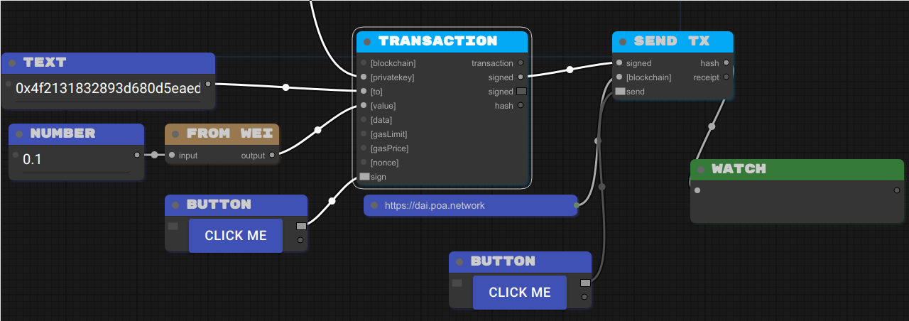 A privateKey é a chave privada do endereço que vai enviar a moeda, o parâmetro to é o endereço que vai receber a moeda, e o parâmetro value é o valor que será enviado. Este bloco retorna a hash de assinatura da transação, o signed.