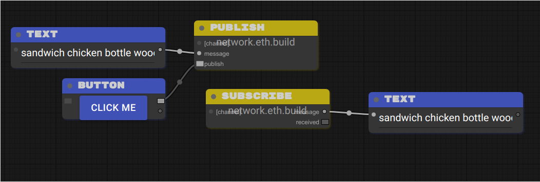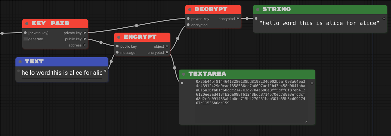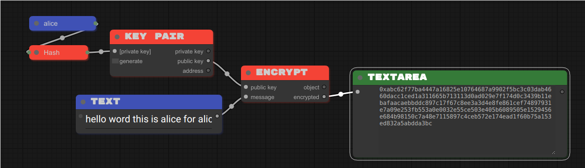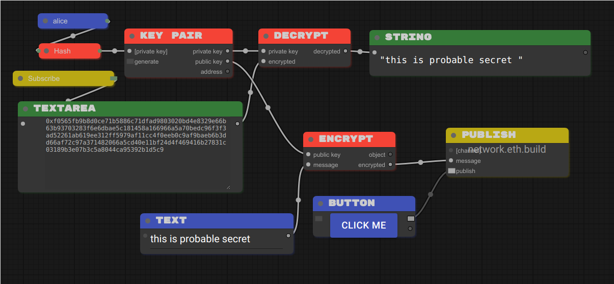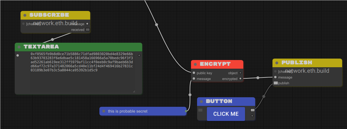 Aqui podemos combinar os blocos ENCRYPT e PUBLISH para enviarmos uma mensagem criptografada na rede. E depois obtermos a mensagem criptografada com o SUBSCRIBE: 0xf0565fb9b8d0ce71b5886c71dfad9803020bd4e8329e66b63b93703283f6e6dbae5c181458a166966a5a70bedc96f3f3ad52261ab619ee312ff5979af11cc4f0eeb0c9af9baeb6b3dd66af72c97a371482066a5cd40e11bf24d4f469416b27831c03189b3e07b3c5a8044ca95392b1d5c9