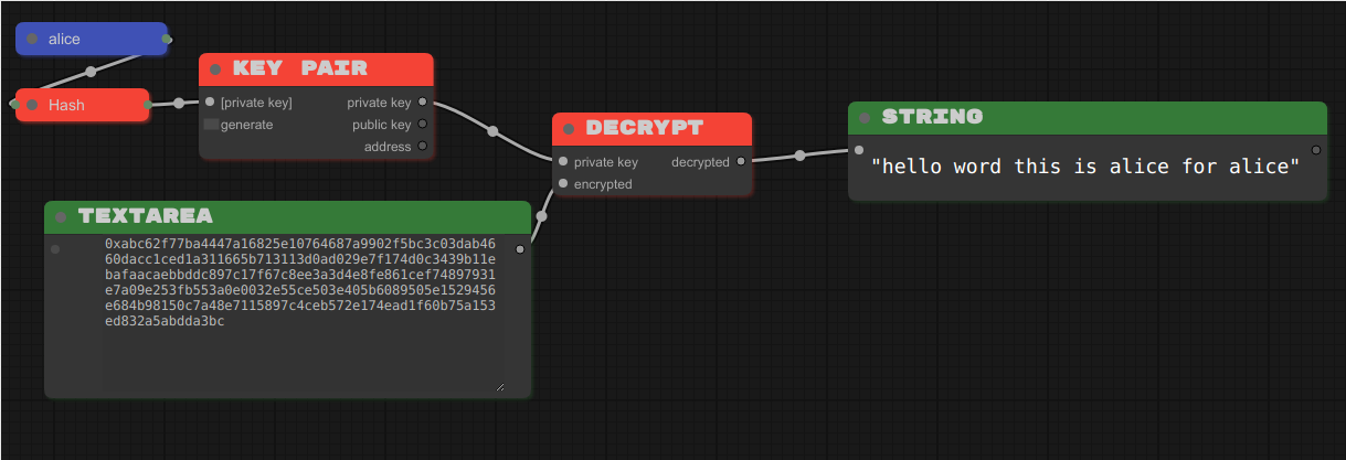 Este bloco devolve como retorno a mensagem inicial descriptografada ("hello word this is alice for alice").