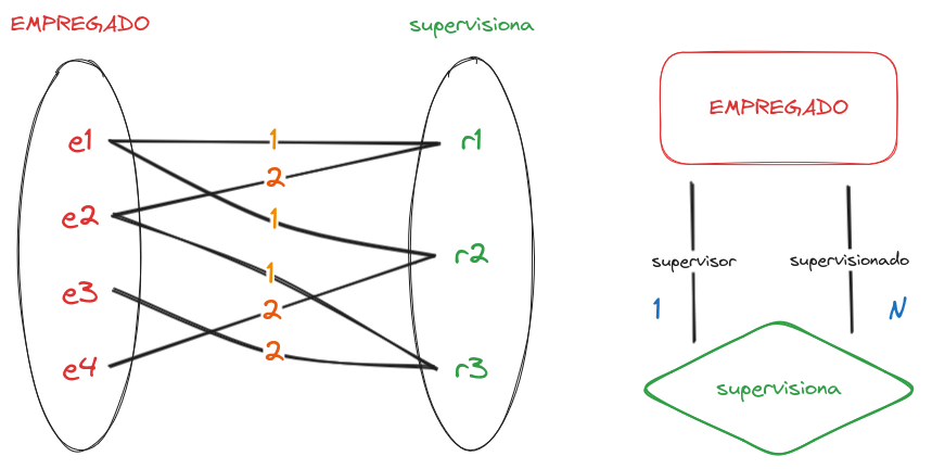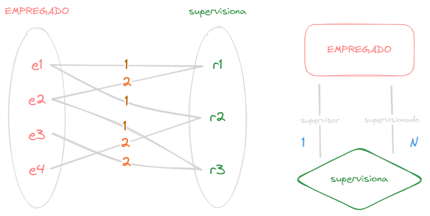 O relacionamento supervisiona relaciona um empregado com o seu supervisor, onde ambas entidades são membros do mesmo tipo de entidade EMPREGADO. Assim, o tipo de entidade EMPREGADO participa duas vezes: uma vez no papel de supervisor e outra no papel de supervisionado. Assim, e1 supervisiona e2, e2 supervisiona e3 e e1 supervisiona e4.