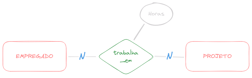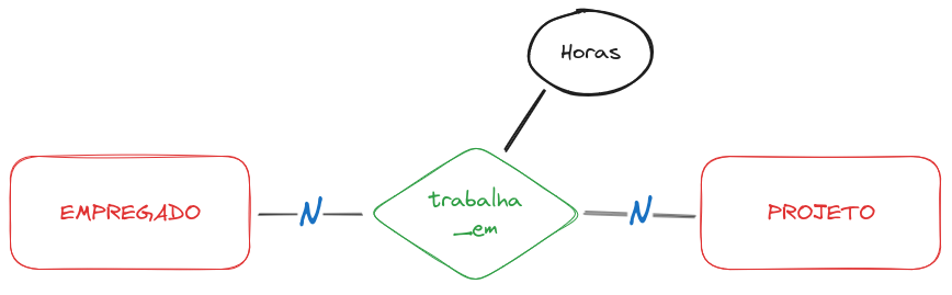 Os relacionamentos também podem ter atributos. Por exemplo: pode haver a necessidade de representar a quantidade de horas semanais trabalhadas pode um empregado em um dado projeto. Isto pode ser representado no relacionamento trabalha_em na forma do atributo denominado Horas
