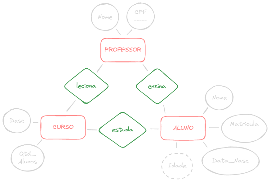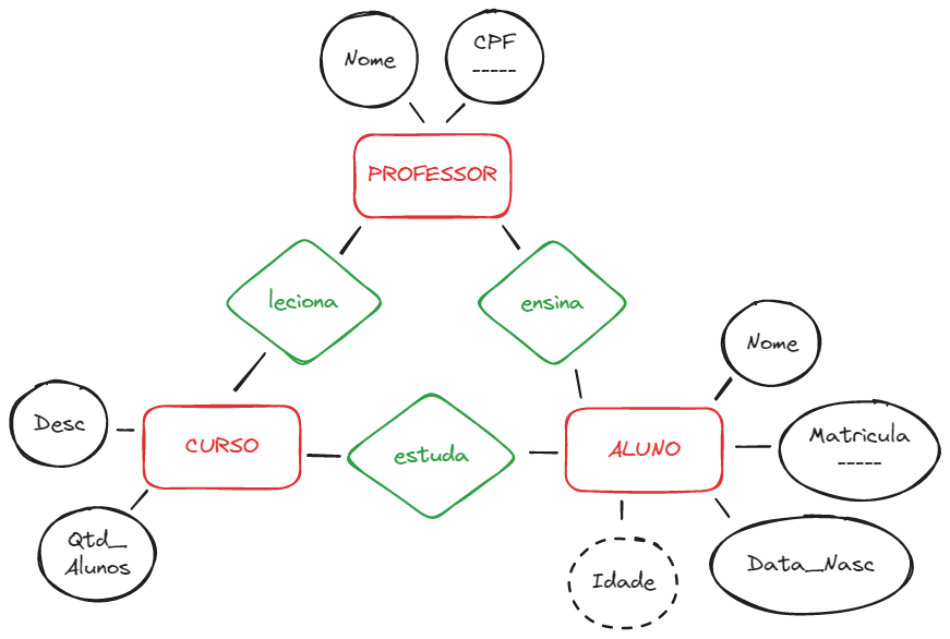 Fomos contratados por uma instituição, e a mesma, precisa ter um sistema para controle de cursos, sabemos que precisamos ter informações dos alunos, dos cursos e de professores. De cada aluno, será necessário armazenar: seu nome, matrícula, data de nascimento e idade. De cada curso será necessário armazenar a descrição e quantidade de alunos inscritos. Do professor, o seu nome e CPF.