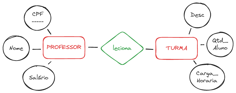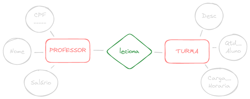 A FAPAM precisa ter controle de seus professores e quais turmas eles estão lecionando. Para isso ela precisa saber do professor o nome, CPF e o salário. Já de suas turmas, a faculdade precisa saber a descrição, quantos alunos possui e a carga horária.