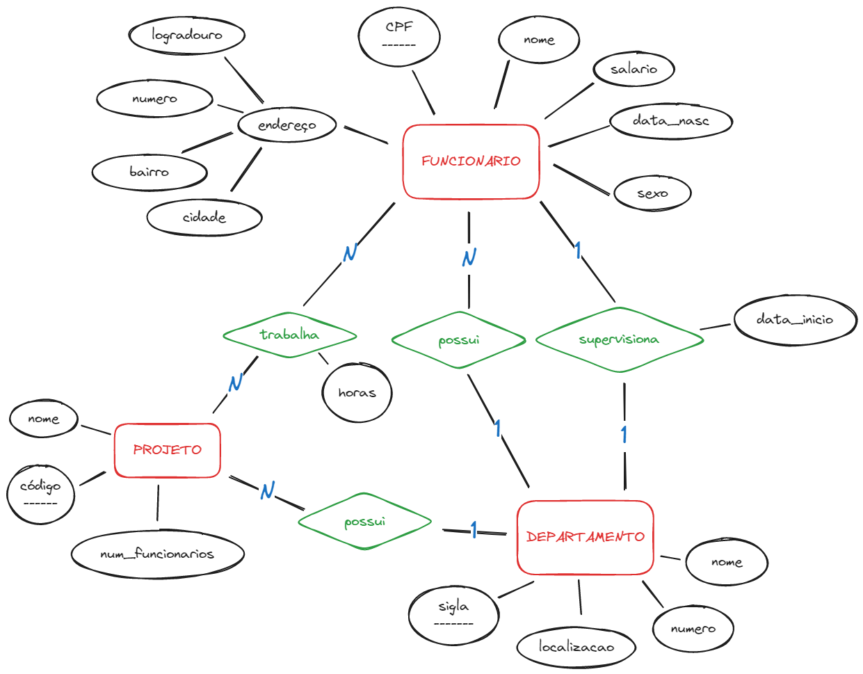 Numa empresa os funcionários são descritos por um nome, número do CPF, salário, endereço (logradouro, número, bairro, cidade), data de nascimento e sexo. Tanto o número do CPF possui valor exclusivo para cada funcionário.