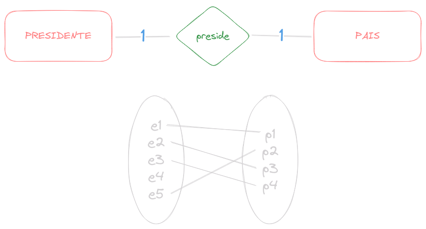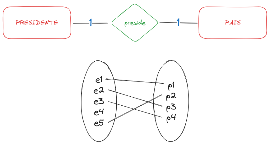 O relacionamento entre a entidade PRESIDENTE e a entidade PAÍS. Cada país tem UM presidente e cada presidente é de UM país, portanto, é um relacionamento 1:1.