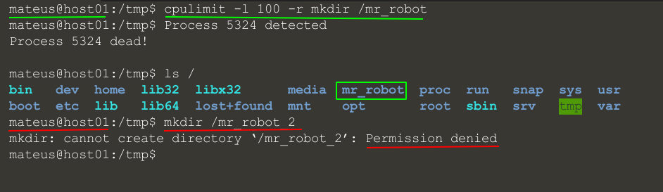 O cpulimit tem a permissão SUID BIT, ou seja, quando executa-lo ele irá trabalhar como root. Sendo assim, podemos criar uma pasta na raiz executando o comando cpulimit -l 100 -r mkdir /pasta, mesmo como um usuário comum: