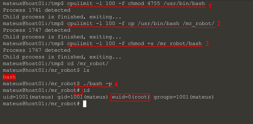 $ cpulimit -l 100 -f chmod +s /mr_robot/bash- Por fim executo o binário