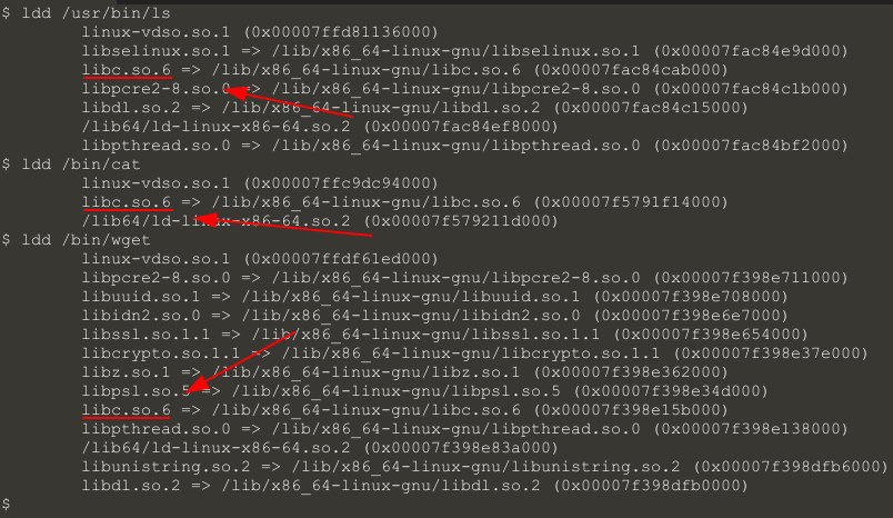 libdl.so.2 => /lib/x86_64-linux-gnu/libdl.so.2 (0x00007fbdc64d4000)Há uma semelhança notável entre os 3 binários, a biblioteca libc.so.6.