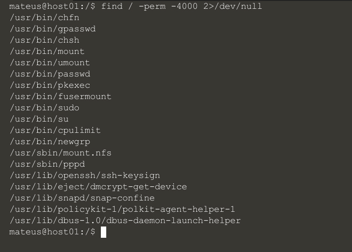 Primeiro vamos pesquisar na raiz do sistema, todo arquivo que tenha a permissão 4000, com o comando find / -perm -4000 2>/dev/null: