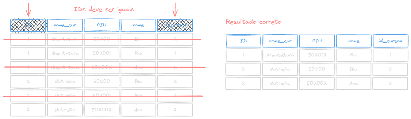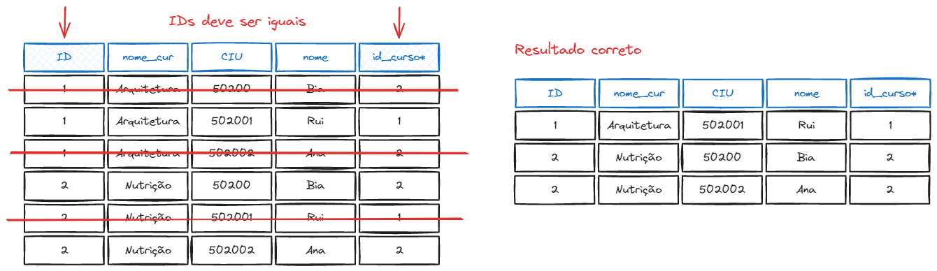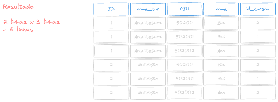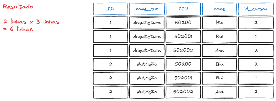 Quando um comando SELECT especifica campos de duas tabelas sem nenhumas restrição ou filtro, o resultado será um número de linhas iguais à multiplicação do total de linhas da primeira tabela () pela segunda tabela (), ou seja .