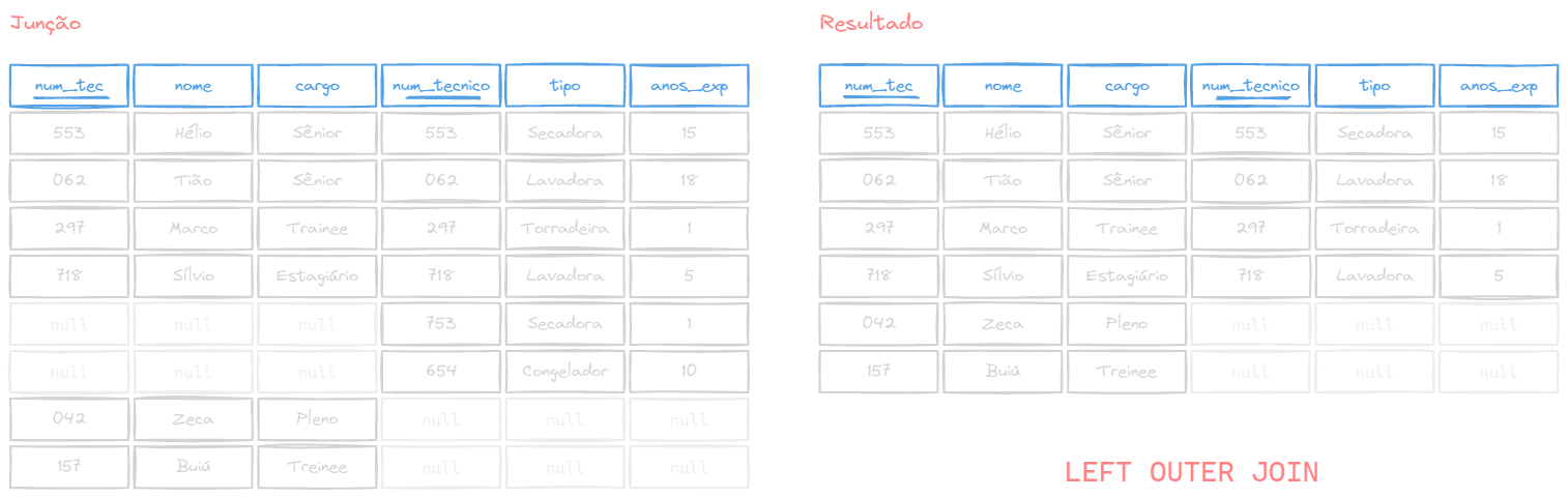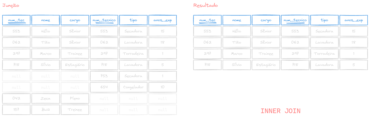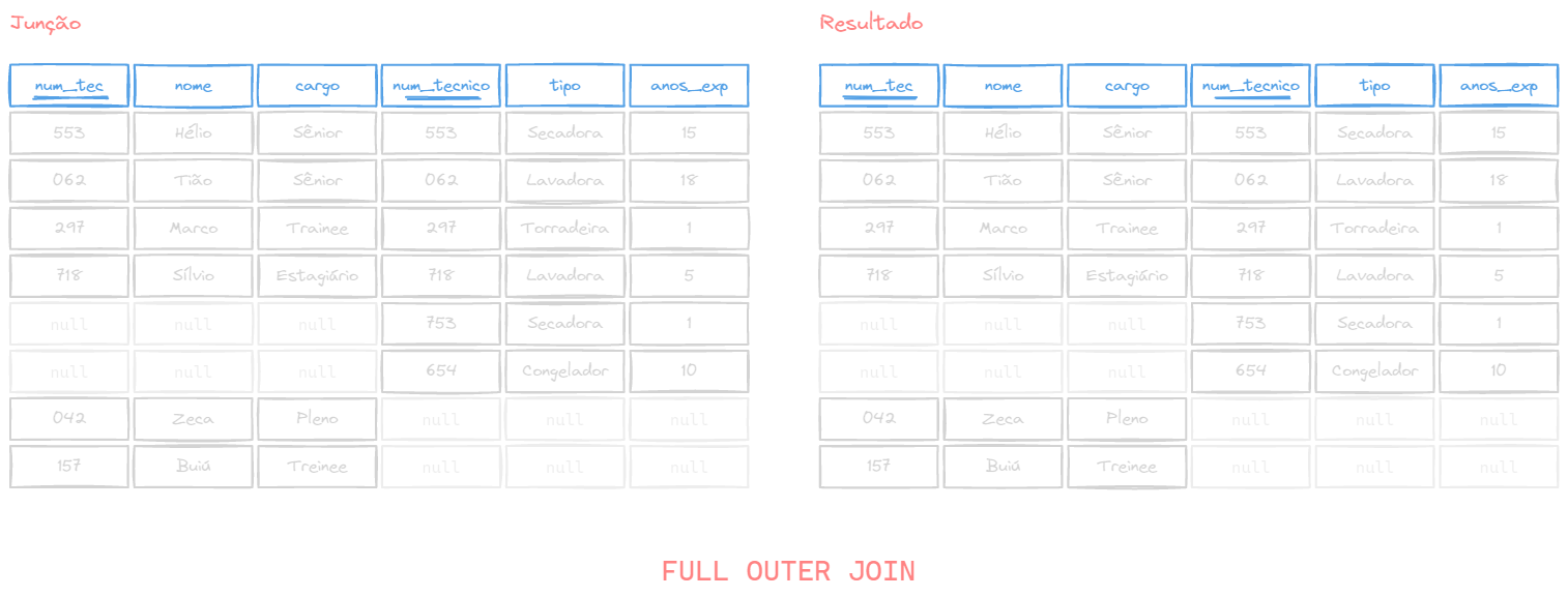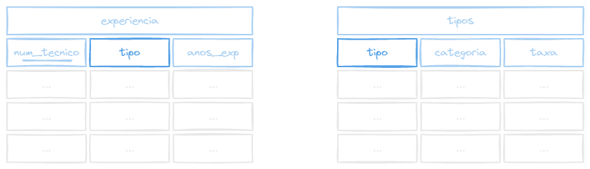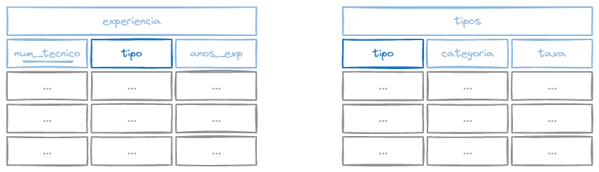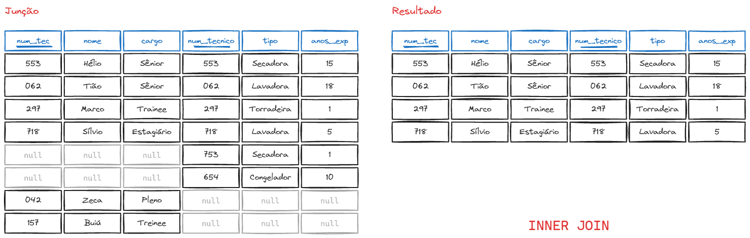 SELECT * FROM (tecnicos NATURAL JOIN experiencia);Repare que não precisamos passar a condição de junção com ON, já que ambas as tabelas possuem a coluna tipo.