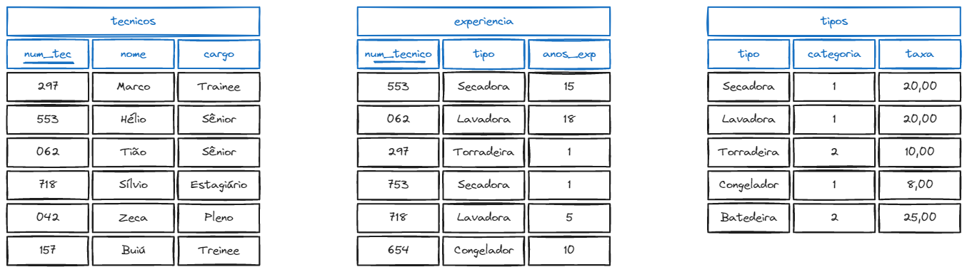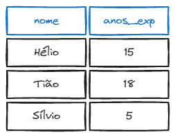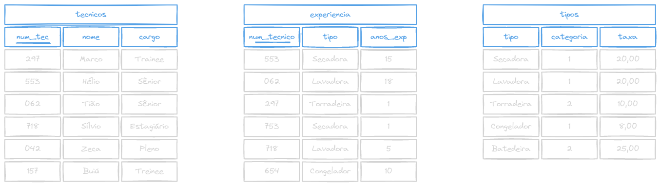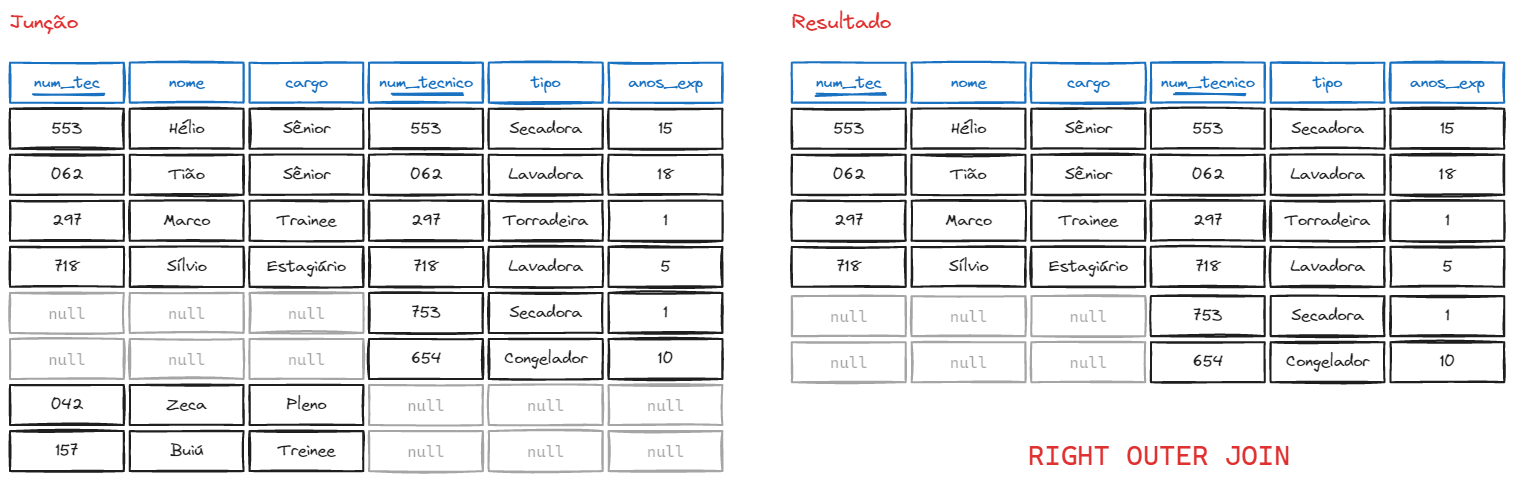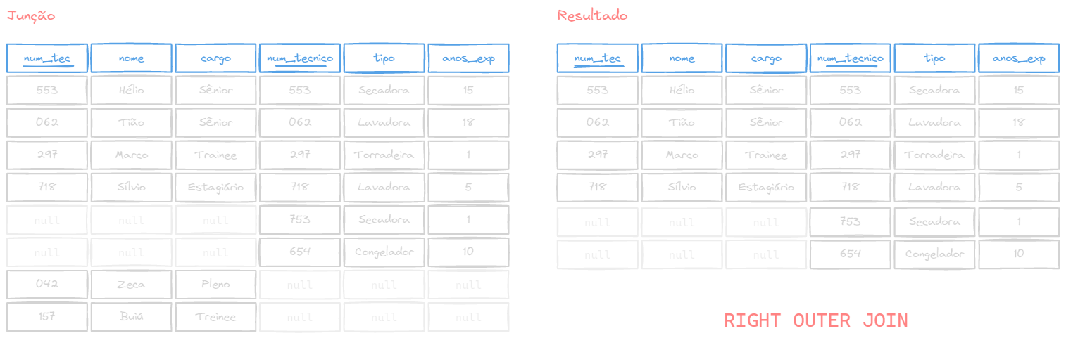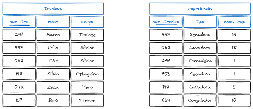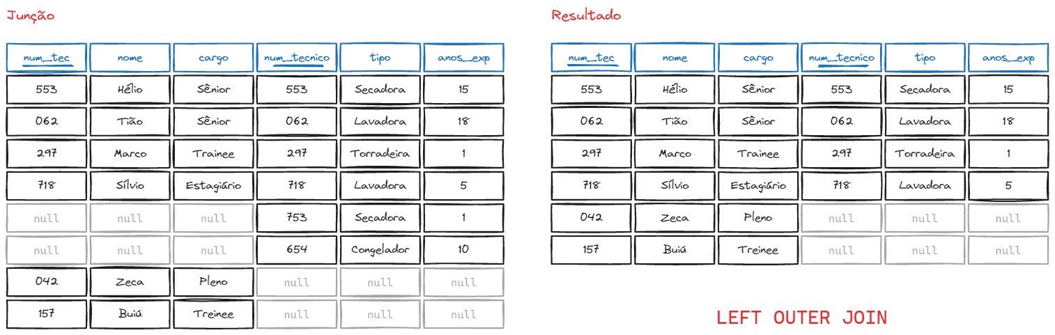SELECT * FROM (tecnicos NATURAL JOIN experiencia);Repare que não precisamos passar a condição de junção com ON, já que ambas as tabelas possuem a coluna tipo.