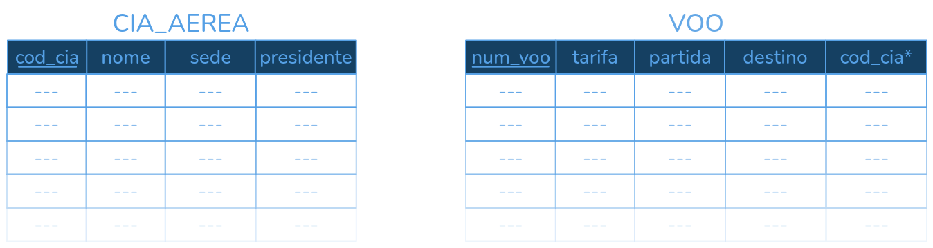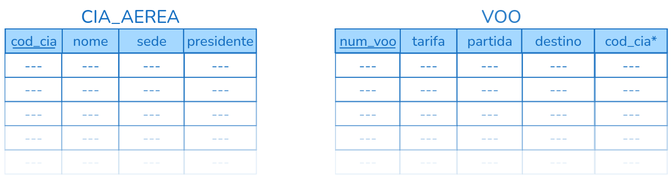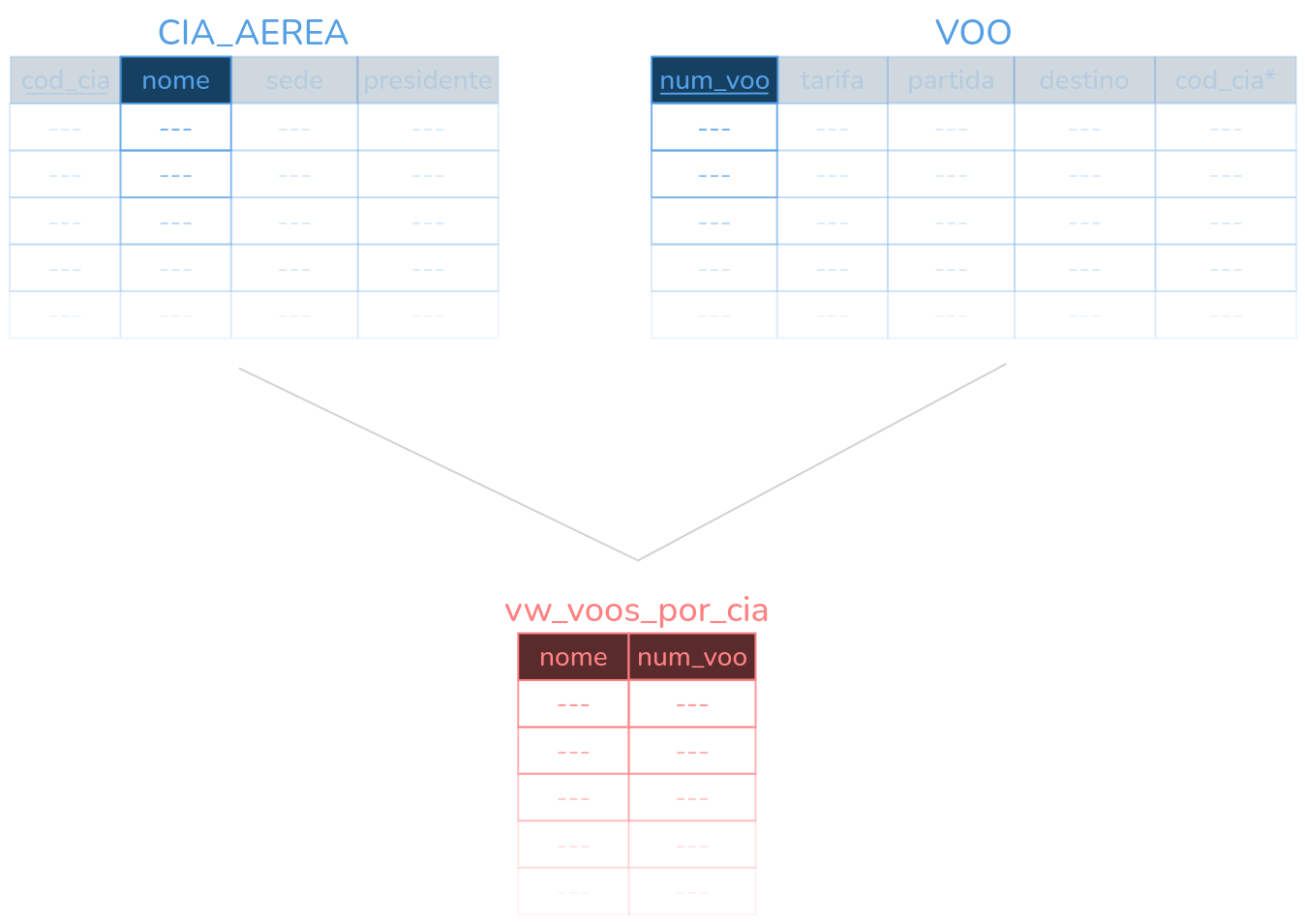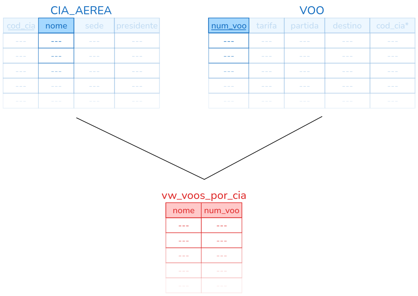 CREATE VIEW nome_da_visao (coluna1, coluna2, coluna3, ...) AS <consulta>Exemplo - Recuperar o nome da companhia aérea e o número de voos que cada uma oferece. Seguindo o exemplo dos voos, considere as seguintes tabelas:
