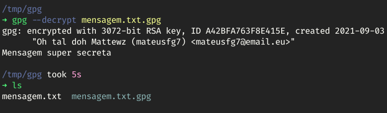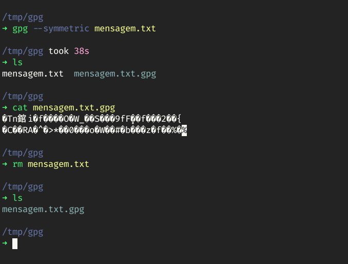 Note que foi criado um arquivo com a extensão .gpg (mensagem.txt.gpg), esse arquivo é o arquivo criptografado, agora é só deletar o arquivo original, e ficar apenas com o arquivo criptografado.