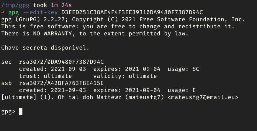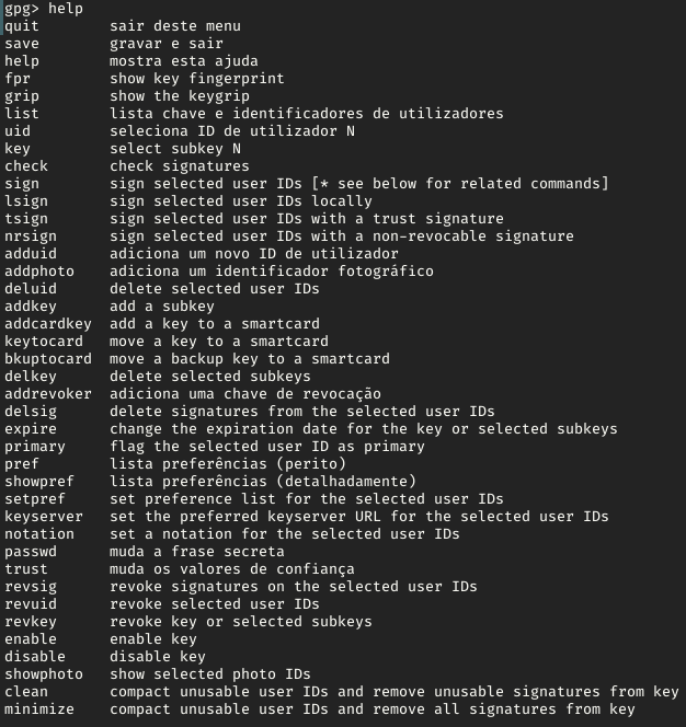 $ gpg --edit-key D3EED251C38AE4F4F3EE39310DA9480F7387D94CApós rodarmos o comando, ira abrir um shell interativo do próprio gpg, com inúmeros comandos e opções para poder editar, para ver todas, basta digitar o comando help.