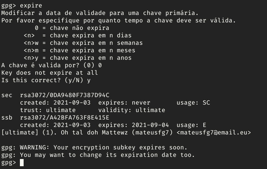 Para exemplificar, mudarei a data de expiração da minha chave para 0, ou seja, vou desativa-la. Após rodar o comando, será pedido o tempo para chave expirar e a senha da chave, para poder realizar as alterações.