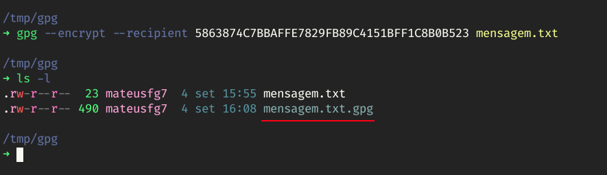 $ gpg --encrypt --recipient 5863874C7BBAFFE7829FB89C4151BFF1C8B0B523 mensagem.txt