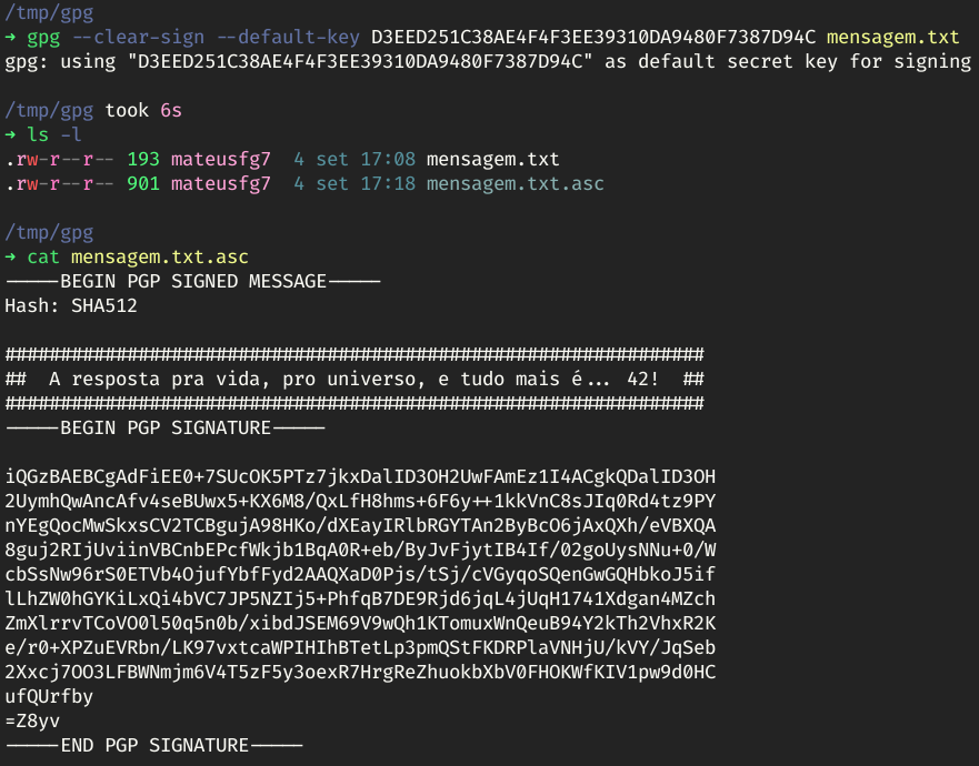 Digamos que escrevi algo muito importante para a humanidade, salvei em um arquivo, e quero assinar esse arquivo, para provar que a descoberta foi minha. Para isto assinaremos a mensagem usando a opção --clear-sign, depois usaremos a opção --default-key, com o fingerprint da chave que será usada para assinar a mensagem, e o arquivo a ser assinado: