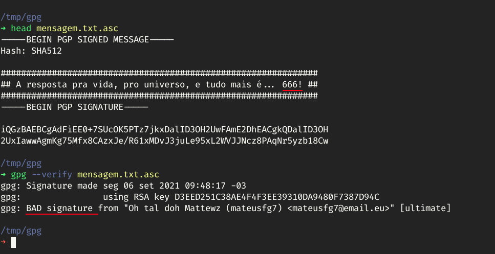 Outra função só gpg é assinar mensagens, imagine um cenário em que você não quer esconder a mensagem, e sim certificar que foi você quem escreveu a mesma. Esse é o objetivo de assinar mensagens, a ideia é você usar a chave privada para assinar a mensagem, e alguém que queira validar que aquela assinatura é sua, irá usar a sua chave pública.
