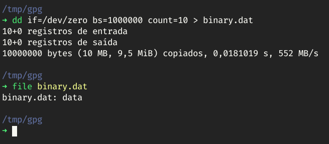 Também podemos assinar um arquivo binário, como PDF, imagem, vídeos, executáveis binários, etc. O processo para assinar esse tipo de arquivo será um pouco diferente porque não se abre um arquivo binário para ler, então o gpg criará outro arquivo separado onde contem a assinatura, e para verificarmos se nosso binário é válido, precisamos tanto do arquivo original quanto do arquivo de assinatura. Primeiro criaremos um arquivo binário com dados aleatórios para fins educacionais, mas o processo pode ser feito com qualquer arquivo binário.