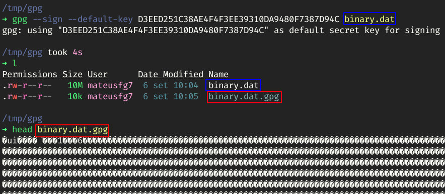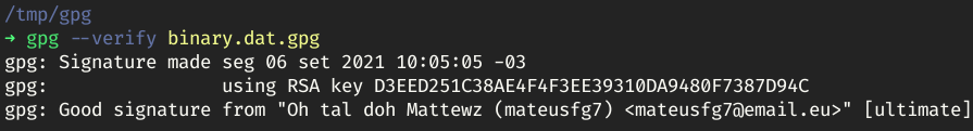 $ gpg --sign --default-key D3EED251C38AE4F4F3EE39310DA9480F7387D94C binary.datCom isso o gpg gerará um outro binário contendo a assinatura do arquivo.