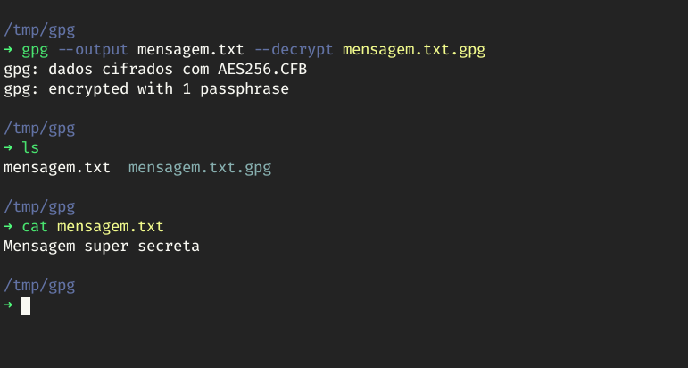 Primeiro vamos criar um arquivo chamado mensagem.txt, com a mensagem "Mensagem super secreta". Nós queremos proteger essa mensagem, para que ninguém que possua a chave possa ter acesso a esta mensagem. Para criptografar a mensagem basta usar a opção --symmetric e o nome do arquivo: