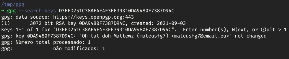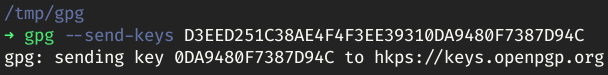 $ gpg --send-keys D3EED251C38AE4F4F3EE39310DA9480F7387D94CNo meu caso minha chave foi enviada para hkps://keys.openpgp.org, se o seu for diferente não tem problema.