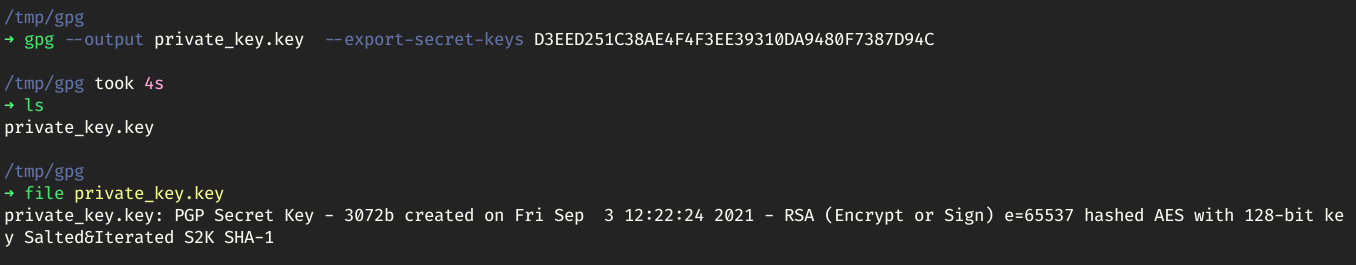 $ gpg --output private_key.key --export-secret-keys D3EED251C38AE4F4F3EE39310DA9480F7387D94C