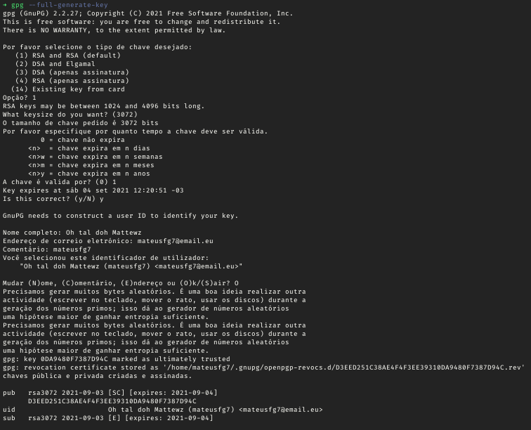 gpg: revocation certificate stored as '/home/mateusfg7/.gnupg/openpgp-revocs.d/D3EED251C38AE4F4F3EE39310DA9480F7387D94C.rev'