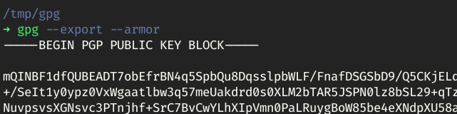 Primeiro precisamos exportar nossa chave para poder compartilhar com outras pessoas. Pediremos o gpg para exportar a chave, usando a opção --export. Também usaremos a opção --armor, para exportar a chave no formato ASCII, sem essa opção a chave será exibida com vários caracteres estranhos.