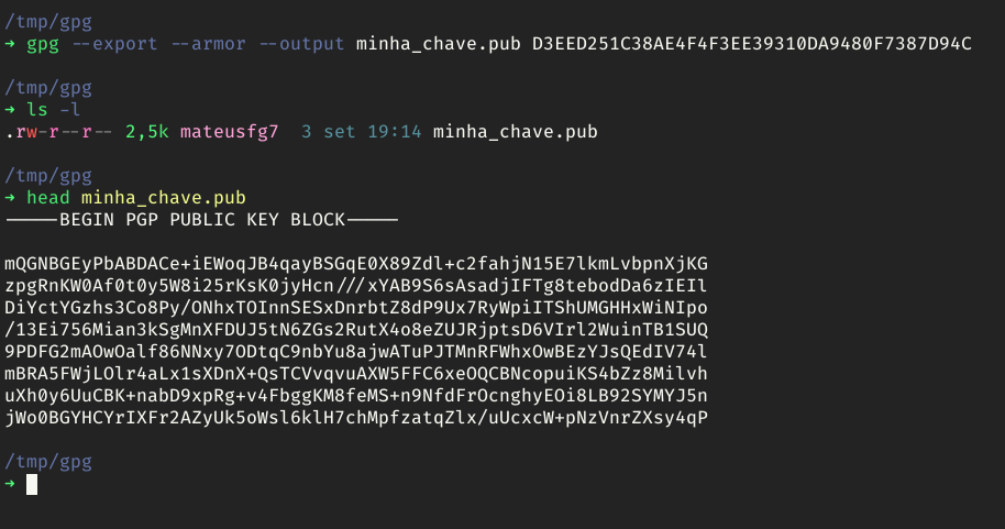 Essa saída não é muito fácil de decorar, então costumamos a direcionar essa saída para um arquivo. Para isto usamos a opção --output, esse comando por sua vez recebe o nome do arquivo de destino como argumento. Por convenção, criamos esse arquivo com a extensão .pub, de public. Logo após, passaremos o fingerprint da chave que queremos exportar. Nosso comando ficará assim: