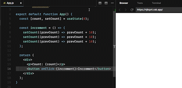 I.e., suppose you have a component that increments the count by 10 three times when a button is clicked: